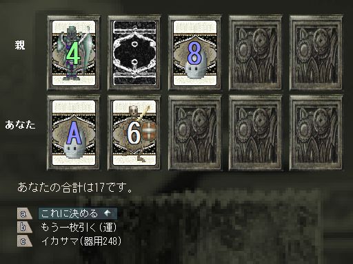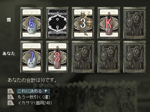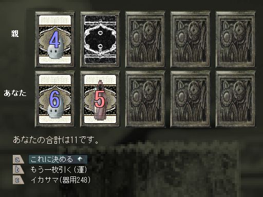 おそらく親の二枚目は絵札、ないしA(合計20か21)と考えたほうがいい。運がよければ雑な数札だったりするが、あまり期待はしないほうがいいだろう。こちらも20か21を狙うしかなく、難易度が高い。