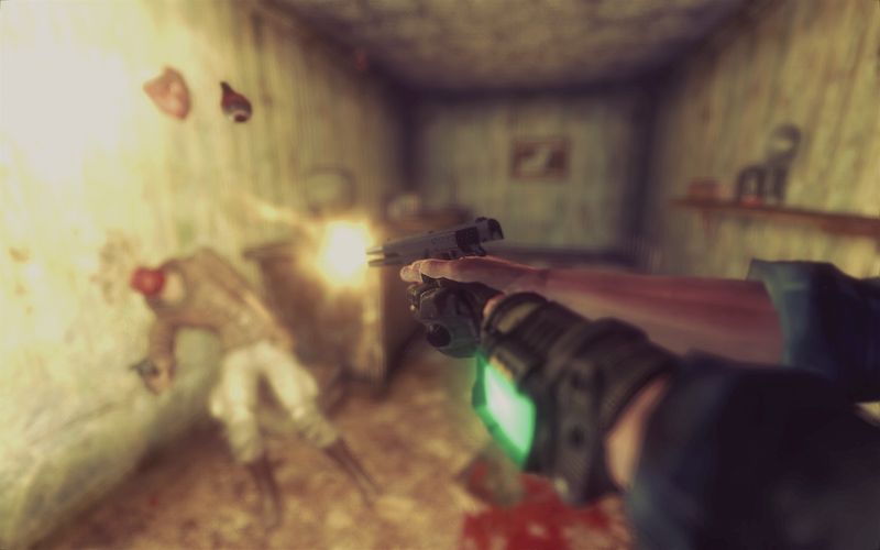 そして…POMP!.45口径のホローポイント弾が女性の顎に命中し、骨に当たって軌道を変えた弾丸が変形しながら暴れ回り、女性の頭部もろとも粉砕する。