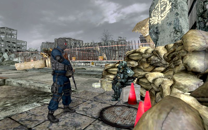 バリケードが張り巡らされ、かつて国政の中枢だった爆心地への侵入を防がんと積み上げられた土嚢の影にはスティール隊員の亡骸が残っている。その目前、旧時代の戦争で大穴が穿たれた道路には巨像の如き強靭な肌を持つスーパーミュータントの死体が散乱していた。