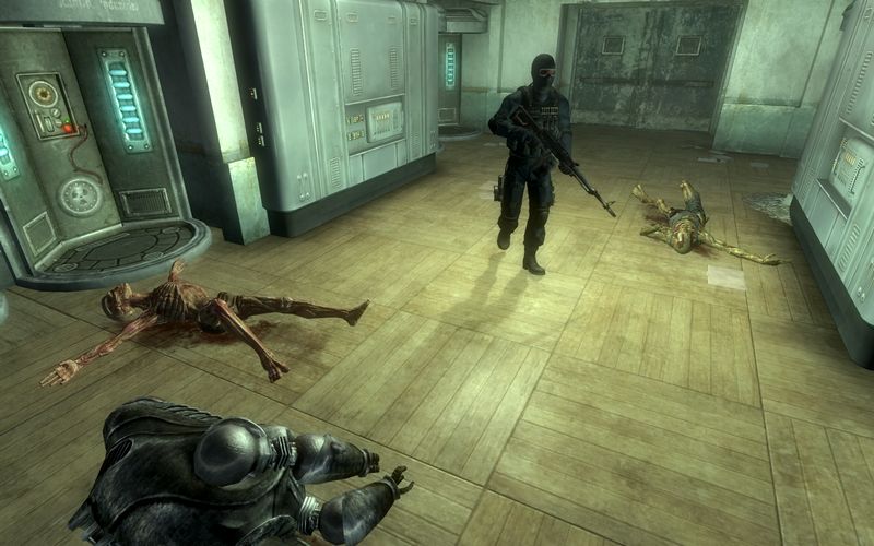 サプレッサーを装着したサブマシンガンの掃射で腕を切断され、エンクレイブの研究員が悲鳴を上げる。