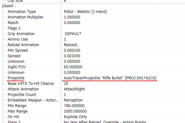 The Jackalで使われているのはAutoTracerProjectile "Rifle Bullet" [PROJ:0017A2C6]というデータ。下から二番目ですね。こいつは射出された弾丸の内部データやエフェクト関連のMeshの指定に使われているものらしいです。たとえば弾速を変えたい場合はSpeedの項目をいじればいいわけですな。