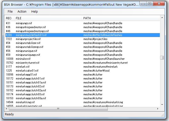 マズルフラッシュのMeshを定義しているのはMuzzle Flash ModelというツリーのNam1 - Model Filenameという項目。これで参照しているMeshファイルの名前がわかったので、今度は専用ツールを使ってBSAファイルをアンパックするかなんかして該当ファイルを抜き出しましょう(Fallout - Meshes.bsaから)。俺はBSA Brouserというツールを使いました。
