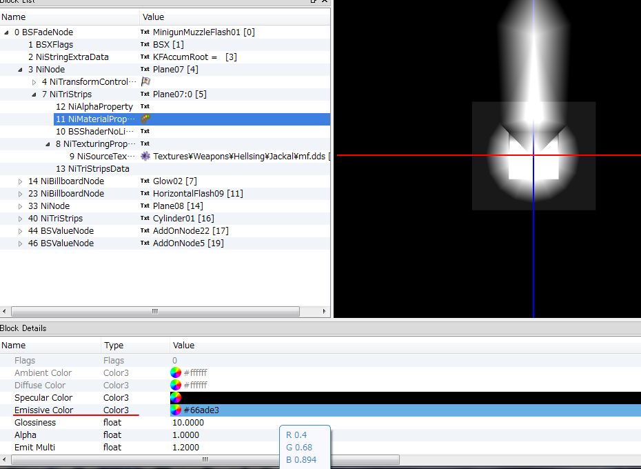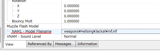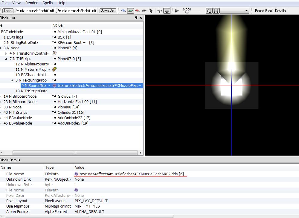あとはminigunmuzzleflash01.nifをふたたびNifSkopeで開き、fxmuzzleflashar02.ddsを指定している箇所をすべて上で作ったTextureのパスに置き換えてください(上の通りに作業したならTextures\Weapons\Hellsing\Jackal\mf.ddsを指定する)。