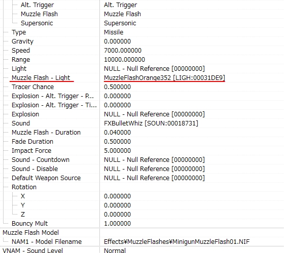 マズルフラッシュを定義しているのは、DNAMツリーのProjectileという項目。どうやらここはバニラのデータを参照しているようですね。