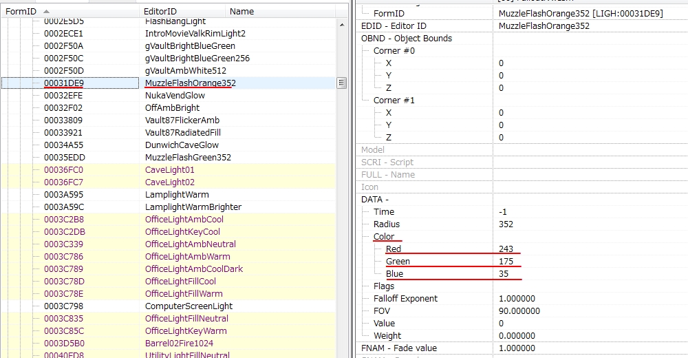 気になる部分ってのはこの、ProjectileデータのDATA - DataツリーにあるMuzzle Flash - Lightという項目。見てみると、MuzzleFlashOrange352などという、見るからにマズルフラッシュをオレンジに光らせそうなデータを参照している。
