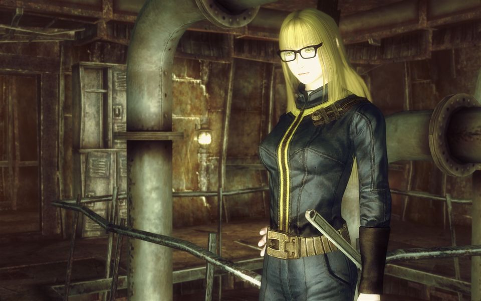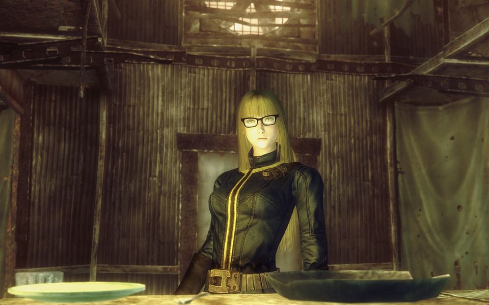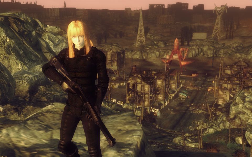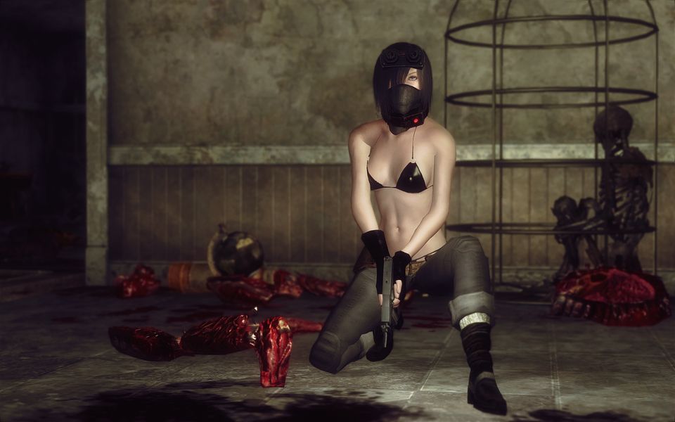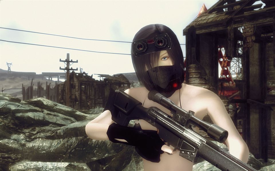 ヒロインであるブレンダも再現。じつは以前のFallout3のSSで出てきた彼女はバニラのコーカソイドで作ってて、マスク外すとけっこう芋っぽい顔面だったので、今回New VegasからLightning Raceを移植してぶち込みました。