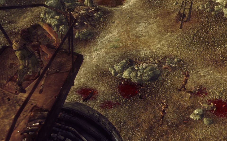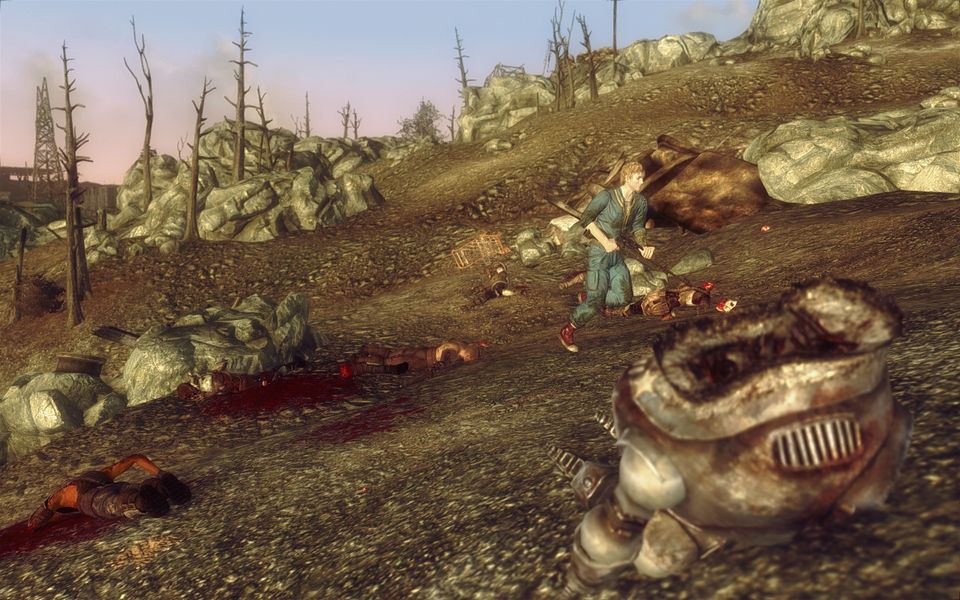 ゲート前はストックホルムが始末したレイダーのほかにも、水乞食の死体や、案内役のプロテクトロン「副官ウェルド」の残骸が転がっている。メガトンから聞こえる銃声はまだ続いていた。