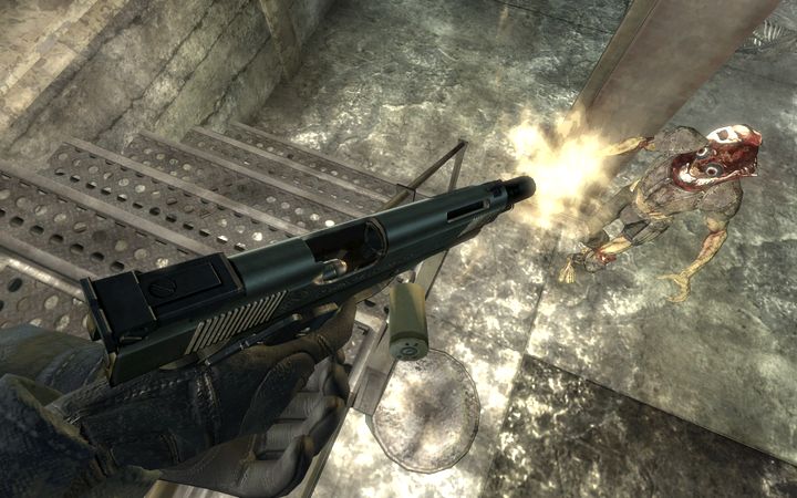 地雷原のとある場所(Very Hardのロックがかかった家の模型、と言えばわかるだろうか?バニラだとクッソしょぼい物しか入ってなかったが、FOOK2ではちゃんと苦労が報われるぞ!)で入手したカスタムM1911が最近のお気に入りです。マガジンに装填された弾が排莢口から覗いているのが見えるだろうか?この驚愕のクオリティ!