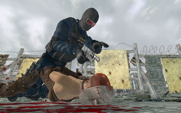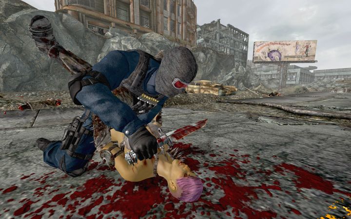 処刑アクションその2。左手は添えるだけ。返り血を顔に浴びないよう、空いてるほうの手でブロックするのは処刑の基本です。プレイヤーの悪趣味ぶりが露呈する一枚。