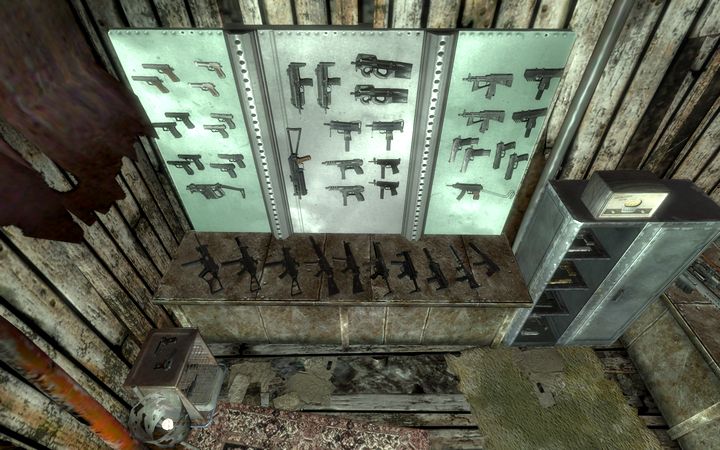 壁に、そして台の上に飾られた小火器。