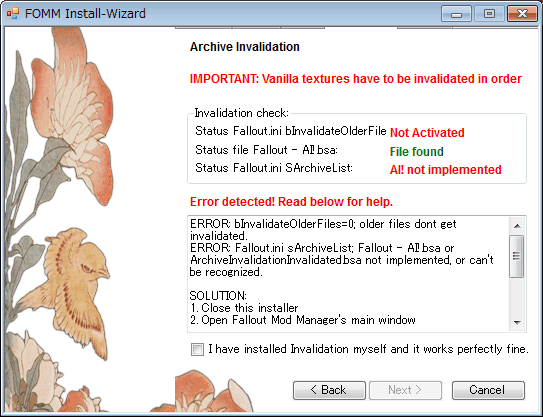 要するにFOMMのTool欄から「Archive Invalidation」を有効化する、もし既に有効化されている場合は「一度無効化し、再度有効化する」!これが単純にして至高の解決策とゆーわけだ。