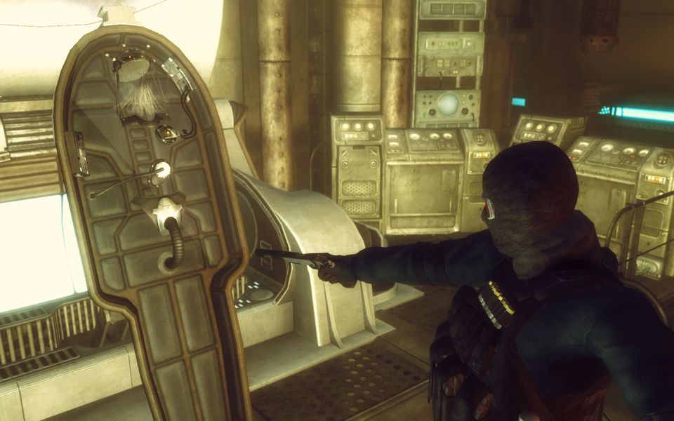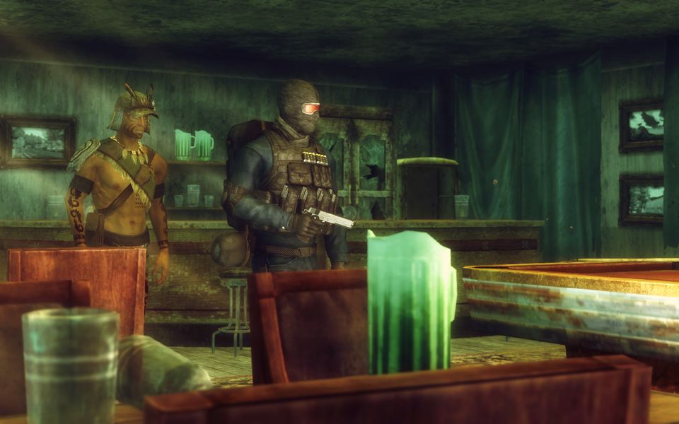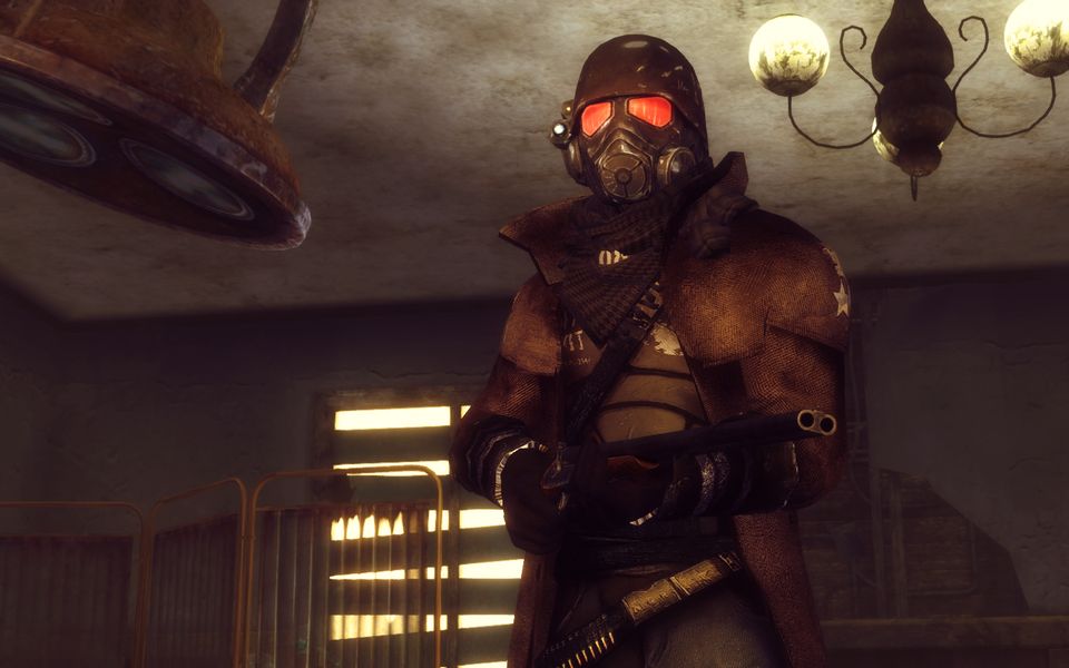 これはLonesome Roadで追加されるユリシーズ・マスクと、SWAT Tactical Gear and MP5A4というModで追加されるゴーグルを併用したもの。見ての通り髪型の影響をほとんど受けない優良な組み合わせなのです。頭部装備は髪型の干渉が難物ですので。