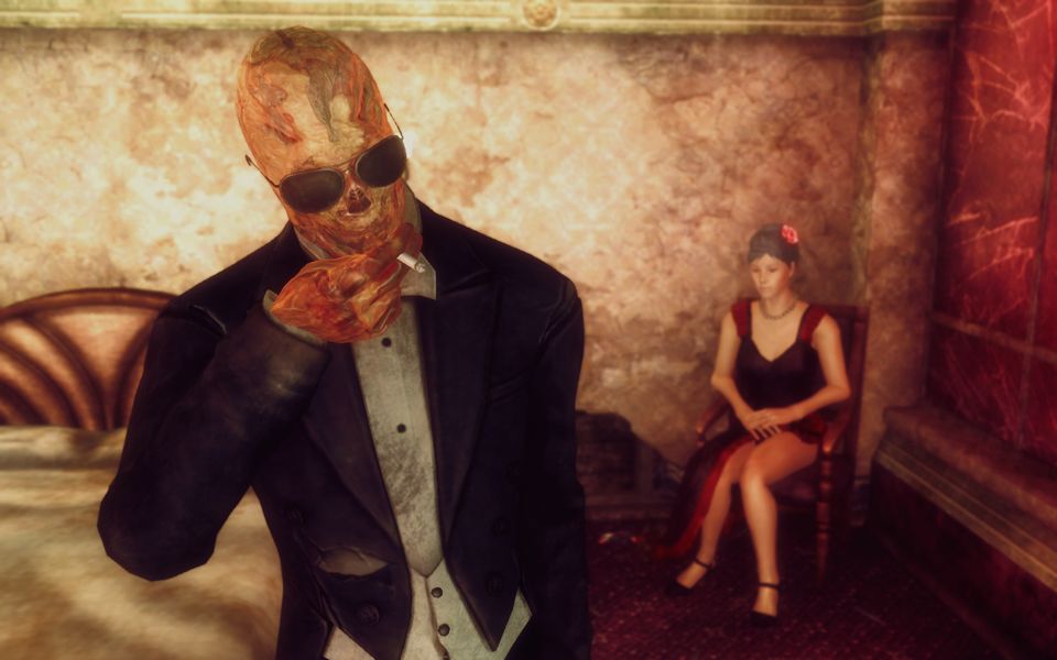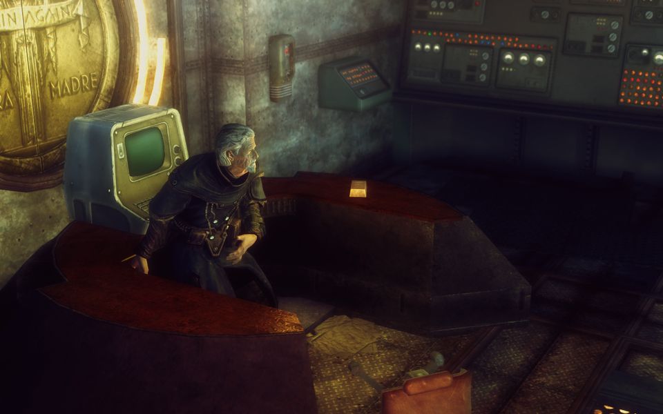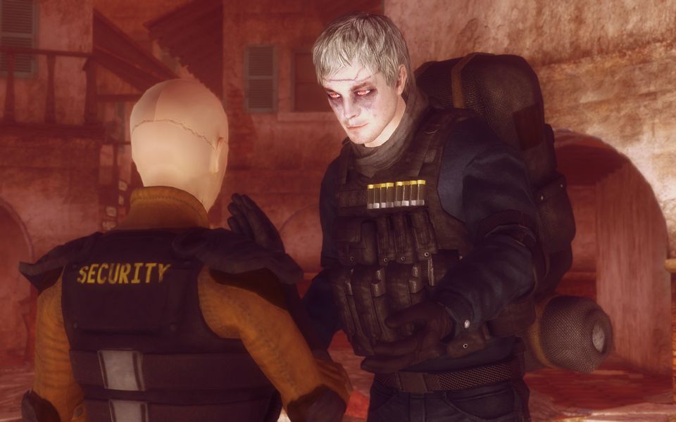ちなみにエピローグ時の金庫室はエリヤの内心を表現するかのようにめっちゃ散らかってます(笑)メンタスが大量に転がってる(&机の上にも置いてある)のがわかるでしょうか。たしかOld World Bruesで入手できる情報で、エリヤも若干メンタス中毒っぽい描写があったと思うので、こういった小ネタを仕込んでみた次第。ドッグ&ゴッドとディーンの画像の悲惨さに比べてギャグっぽくなってしまうので、極力雰囲気を壊さないよう控え目にはしたつもりですが(なのでインパクトの強い正面アップ顔は没になった)。