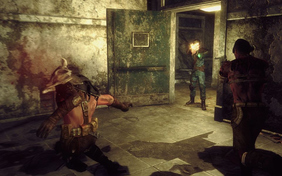 俺は扉を蹴破ると同時にV.A.T.S.を作動させ、目の前でいままさに扉の取っ手に手をかけようとしていたモヒカン男の肩、次いで頭を撃ち抜く。