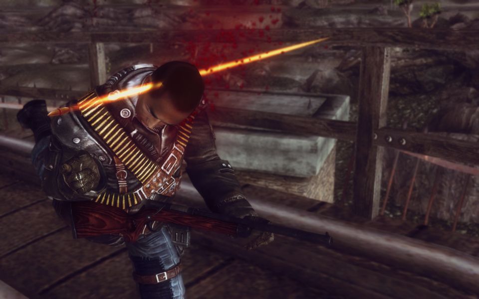 キシュ…という、合金をハンマーで叩いたような銃声とともに大口径ライフル弾が射出され、火線の尾を引いた銃弾がギャングの側頭部を綺麗に貫通する。