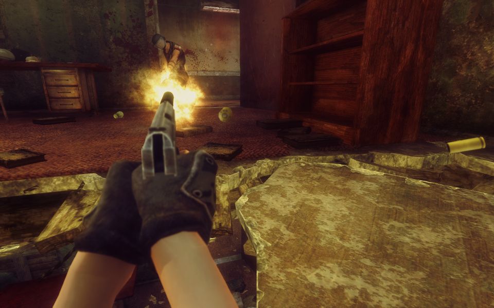 しかし彼の想像に反し、ブレンダは閃光手榴弾が破裂すると同時にホールへ飛び出すと、片手に拳銃、もう片方の手に切り詰めショットガンを握って前進しながら撃ちまくった。