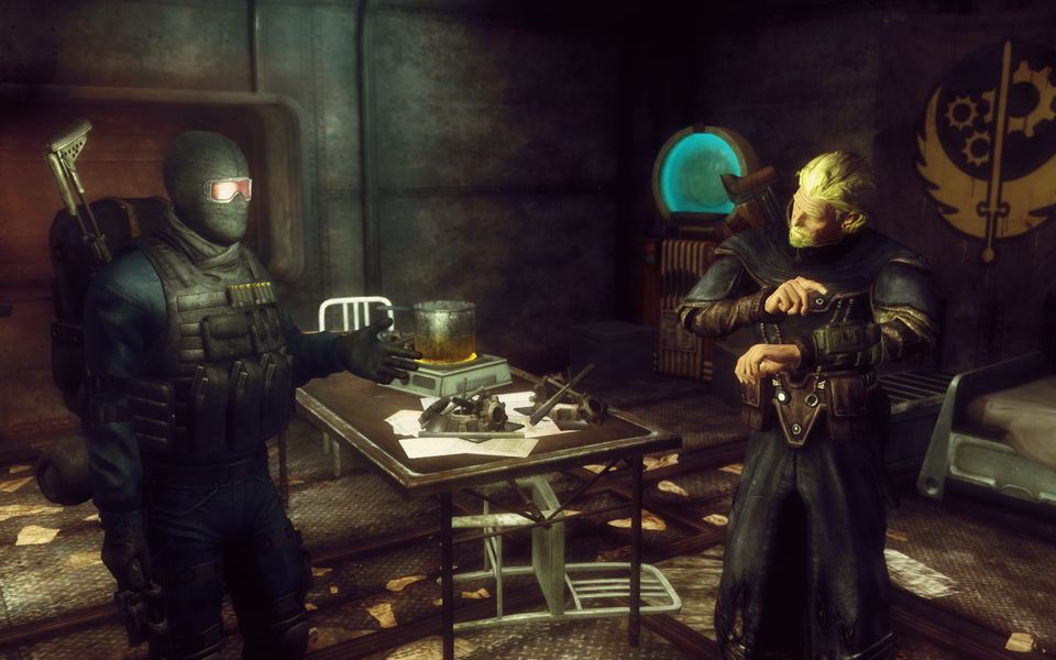 かつてモハビBoSは、ヘリオス1という巨大な発電施設を拠点に活動していたことがある。やがて彼らはNCRと交戦状態になり、防戦に適さない場所での戦いでモハビBoSは半壊。当時の責任者であるエリヤは解任と同時に行方をくらまし、生き残ったBoSの残存部隊は地下施設での隠遁生活を余儀なくされた。