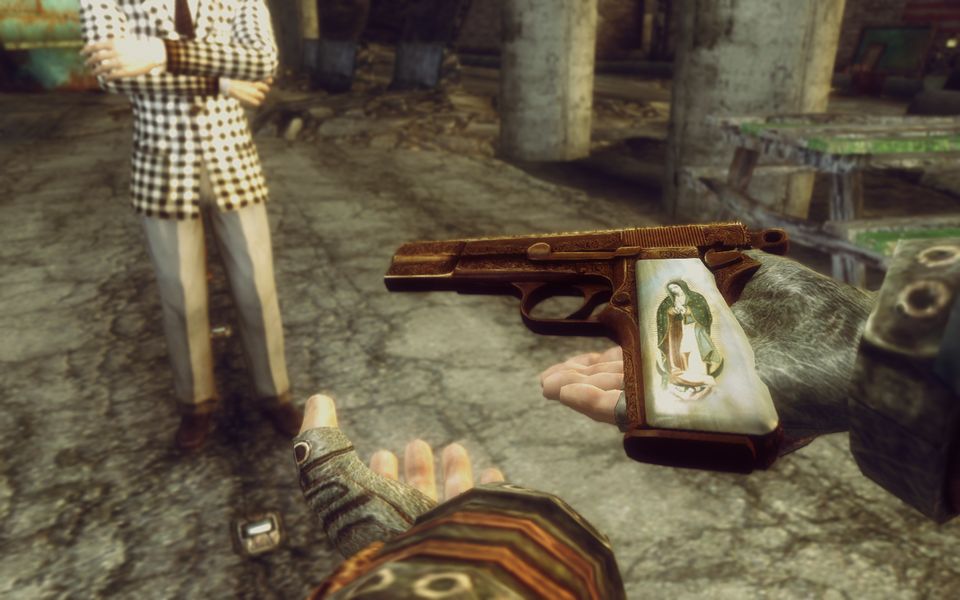 因果はどんなふうに巡るかわからない、ということで、ベニーの愛銃マリアの出自をでっちあげてみました。本来はマリアのカラーは金ではなく銀(クロムめっき?)なのですが、せっかくなのでテクスチャを改造。FOOKはバニラに登場する銃のほとんどをMeshから差し替えるのですが、なんと新Textureはグリップのマリアの肖像が消されてて参った。Textureの配置が違ってるかもわからないので、この部分だけバニラのTextureを抜き出して移植しました。面倒臭かった…