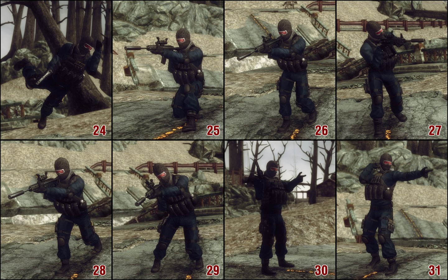 また一部銃を持つことを前提としないポーズでも銃を持たせていますが、これは銃を持ったポーズとしても通用するかどうか(ボーンが設定されているかどうか)のテストです。本来はメレー武器の確認もすべきなんですが、俺はメレー武器使わないのでやりません。すいません。