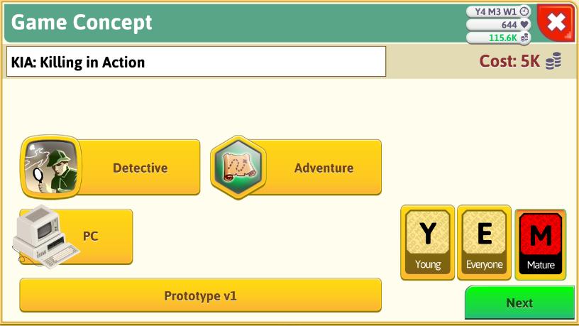 だがしかし、俺はPCで成年向けタイトルを作ると決めたのだ!八作目である今回は探偵ADV「KIA: Killing in Action」に決定した。今回はグラフィック&サウンド、ストーリーに注力している。デバッグに苦労したが、選択は間違ってないはず、頼む売れてくれ!うちの会社はもう家計が限界だ!