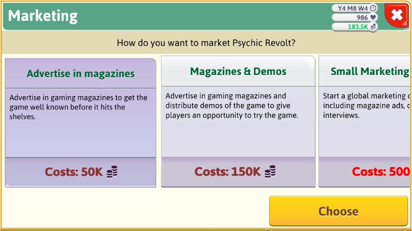 でー、マーケティングってのは要するに広告かい。最低でも50kから、ってのはちょいと厳しいもんがあるが、せっかくだ、利用してみようじゃあないの。一番安いコースでな。宣伝の甲斐あったか、「Psychic Revolt」のメディア評価は8/7/8/8と売り上げが見込める程度の数値。あとはコンシューマ市場というのがどう影響してくるか、だが。