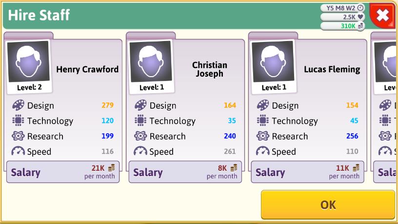 全体的に見ればヘンリー・クロフォードの能力が高いのだが、給料がちょびっと高い。一方、テクノロジーが低いのが難点だが、デザインに才があり、なにより作業スピードがえらく早い(&給料が安い)クリスチャン・ジョセフが目に留まった。彼を採用する。