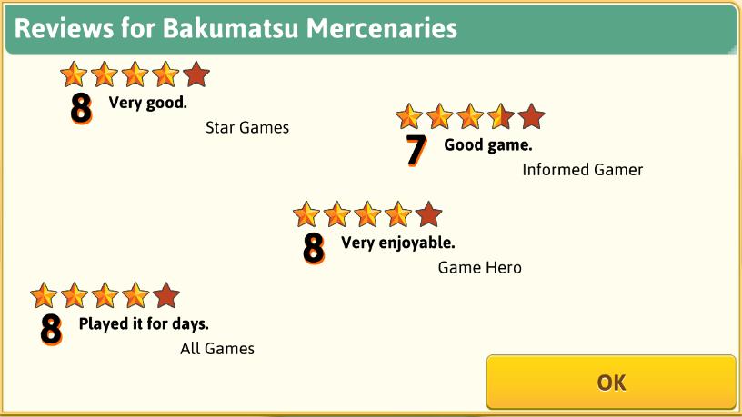 「Bakumatsu Mercenaries」のメディア評価は概ね良好で一安心。これだけで一定の売り上げは見込めるから、先の予定が建てやすいのだ。ひとまずは小ヒットを連発しながら技術開発を続け、来るべき3D時代へ備えるとしますかのう。