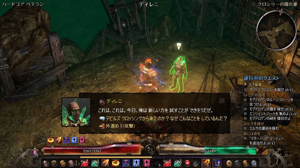 「おっかしいと思ってたんだよねェ、アーコヴィアにリフトゲートがあるってことは、アレはイセリアルの置き土産みたいなもんだからさ、グリムドーンのときに来てたはずなんだ。同じようにリフトゲートが開いてたローワー・クロッシングやバーウィッチは死霊どもが盆踊りの真っ最中だったってのに、このあたりじゃイセリアルの姿を全然見かけないのはどういうこった?ひょっとしたらギャングどもが退治してくれてたのかもと思ってたが、なんのこたァない、普通に考えりゃ…アンタらとグルだった、てぇ以外の展開は思いつかんわね」