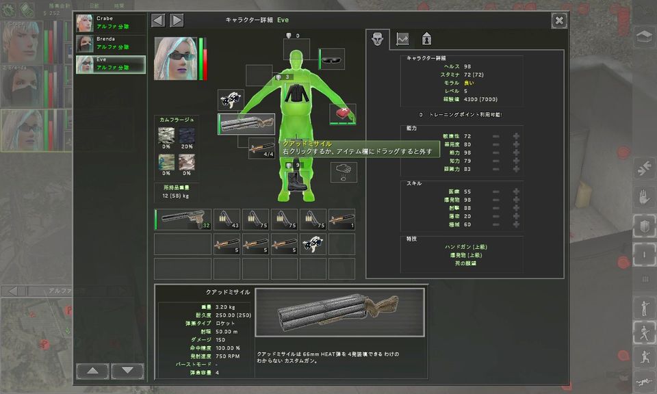 またイヴは66mm HEAT弾を使用する四連銃身式クアッドミサイル改造銃を所持している。発砲のさいにかなり強烈な反動があり、常人が使用した場合、肩の脱臼ないし骨折は免れないだろう。