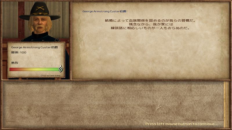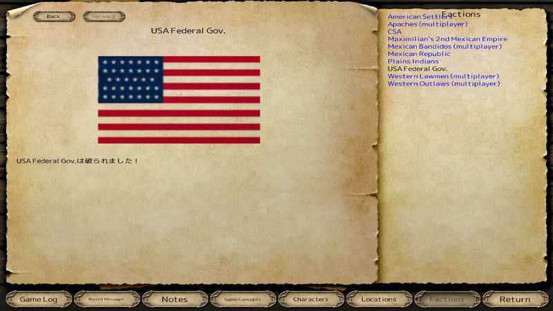 このあたりまでゲームが進むと壊滅した勢力のロードが他の残った勢力にガッツリ加入しており、メキシコの知事公邸(Nativeにおける城)に北軍の将校やらカウボーイやらインディアンの酋長が集っているという非常にアレな光景が。