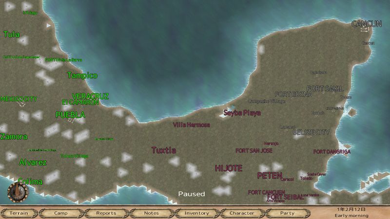 ちなみに白地が南軍、緑字がメキシコ共和国、紫字がメキシコ第二帝政の領地です。たしかCANCUNは最初メキシコ共和国の領地だったはずだけど、ここだけ飛び地なのでゲーム開始直後にメキシコ第二帝政に取られてた気がする(歴史的背景を加味してか、この二勢力はしょっちゅう開戦と停戦を繰り返している)。