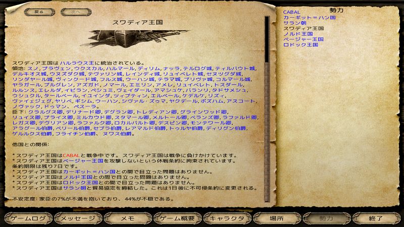 今回大臣に任命したアライェンは、パーティーに常駐しているマルニド・ニザールと相性が悪く、イブデレスを奪取するまでの士気の低下が若干気がかりでした。いちおうCtAはコンパニオン間の相性を設定でOFFにできるのですが、それではやはり面白味に欠けるかなあということで。