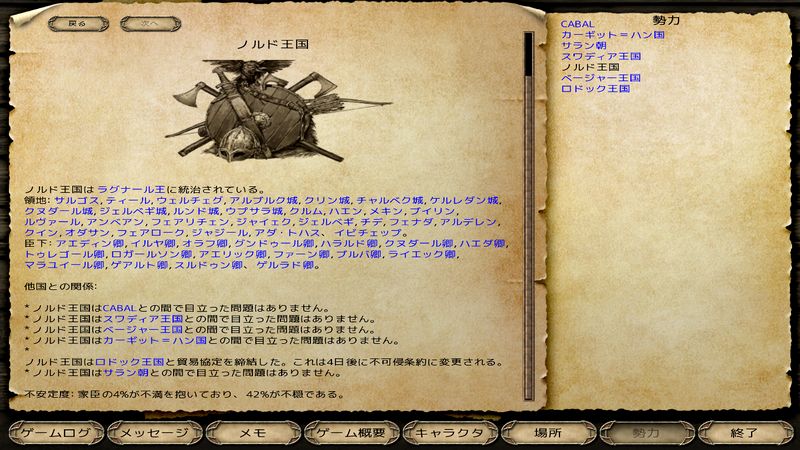 「えーと、ベージャーとスワディアに一方的にやられっぱなしのノルドですな。こちらは取られた領地を取り返すこともなく平和を貪っているため、領地を取られた諸侯が不満を抱いているようです」