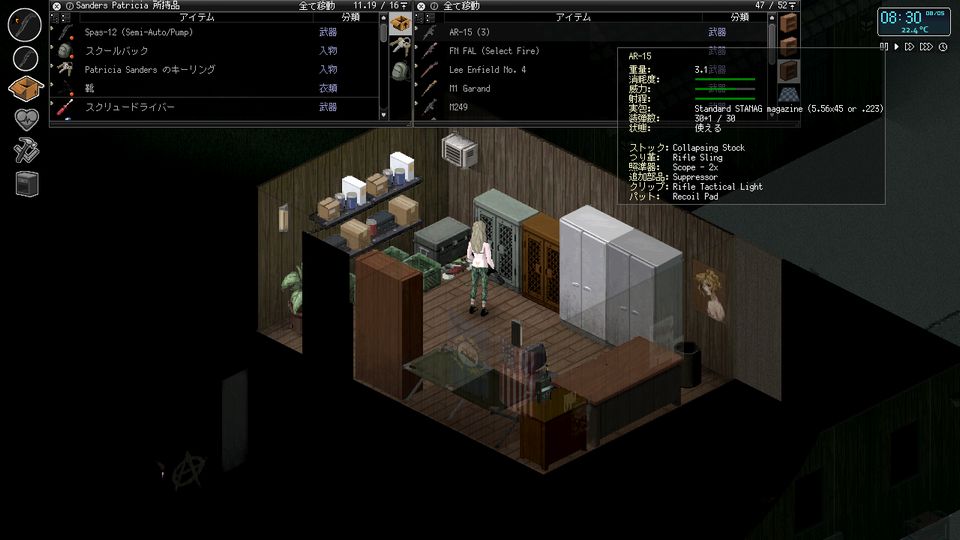 最初は銃火器のモデル変更をやっていたんですが、Zomboidは基本的に俯瞰視点だということ、そして内部解像度が低い?ために最大までズームしてもディティールが潰れてしまうので、多少凝ったものを作っても目立たないというか、ぶっちゃけよくわからないんですよね。