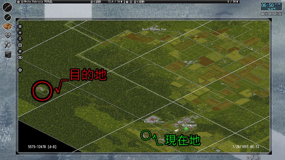 上の画像で書き加えたガイドが示すように、目的地までは未舗装路を辿って森の中を長距離移動することになります。途中で物資を補給できるポイントが存在しないので、あらかじめ水や食料を用意しておいたほうがいいでしょう。