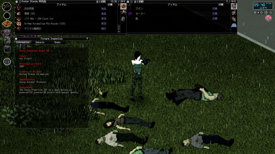 雨降りしきるなか、ゾンビとの戦闘でデイジー・パワーライン・モデル201を入手。これは実在するトイガンで、海外の規格である.177inch(4.5mm)BB弾を使用するエアコッキング式のピストルです。海外製のBBガンが日本製より威力が高く、ペレットも鉛製やスチール製のものが販売されているため、組み合わせによっては2~3Jの威力が出たはず。