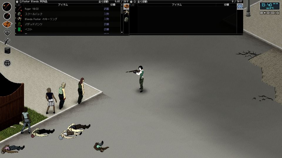 先日の戦闘でルガー10/22と、.22LR弾薬を大量に確保できたので、バカスカ銃を撃ちまくりながら移動します。そこいら中からゾンビが集まってきますが、どんどん倒していきます。