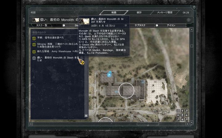 後日改めて彼に接触すると、新たなタスクとして必要物資を複数のStashに補充せよとの命を受けた。またこの面倒なタスクかよ!Clear Skyだけに飽き足らず貴様らもか!