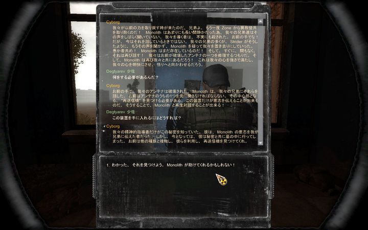 Pripyatに戻り、Cyborgに報告すればこのタスクは終了。次のタスクを請け負うため、また後日来るように言われる。