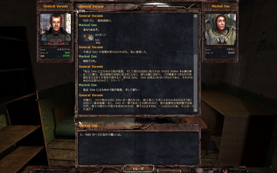 ひとまず鉱山を放置しCordon経由でBarまで撤退。DutyのVoronin大佐に相談したところ、「Sinの連中と話をつけてやる代わりにJoin Dutyしなさい」と言われる。入会金10000Ru、いまなら雑用をこなすと半額免除しちゃうよ!大盤振る舞いだね!ということだが。