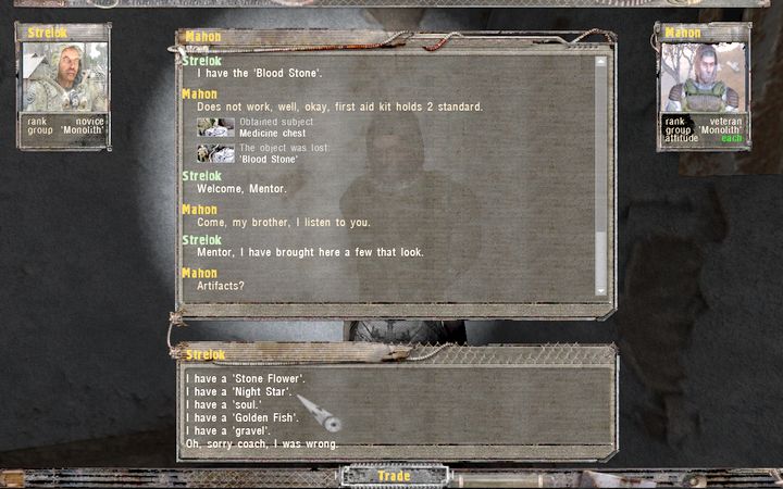 それとMahonという男はアーティファクトと引き換えに弾薬などのアイテムを交換してくれる。Pripyatでアーティファクトを回収していれば、ここでぐっと展開が楽になるはずだ(ぶっちゃけ、体力回復と放射能除去以外の効果を持つアーティファクトは不要に思える)。