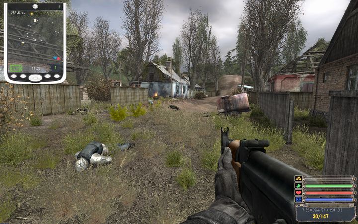 マカロフ一挺の最弱装備なので、しばらくその辺に身を隠しながら様子を窺う。キャンプのLoner Stalkerが全滅したあたりでいそいそと装備を回収し、裏取りをしながらMilitaryを始末していく。