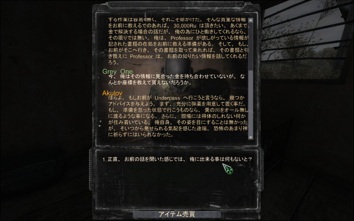 さて工場敷地内にいるStalkerのAkulovから情報を貰い、Underpass(CSのAgroprom underground)へと向かおう。30000Ruあれば現金で横面をはたき倒していきなりArmy Warehouseへ向かうこともできるが、ゲームを楽しむためにあえて苦行を積むのも良かろう。MAP1つ見過ごすというのは大きな損失だ。