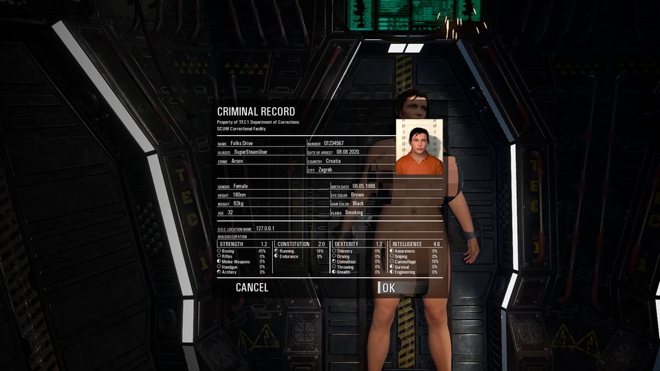 というわけで、SCUM適当攻略日記です。何度目かのキャラクタークリエーション。ステータスが低いのはおちちをそれなりに大きく設定してしまったからです。INTが高いので必然的におでぶちゃん体型になる、アトリエ・シリーズ最新作への出演を目指しているかのような太ましい脚もさることながら、横から見ると腹回りもけっこうヤバイ。