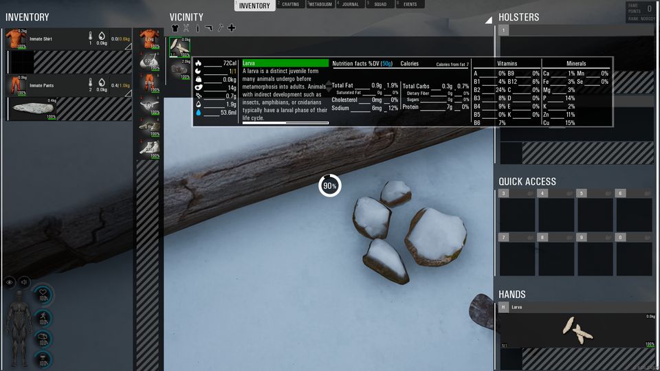 イモムシはほとんどタンパク質のカタマリのような食品で、脂質をほとんど含まない優秀なダイエット食です。摂取カロリーが低いので飢えないためには大量に食いまくる必要がありますが…というか今回のプレイではまず体内脂肪を減らすために飢餓状態を維持し続ける必要があるので、かえって好都合とも言える。
