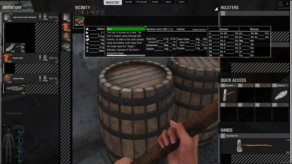 納屋っぽい建物の樽から発見したナツメヤシの実。主に炭水化物であり、僅かにタンパク質も含まれる。脂質はほとんど含まれない。