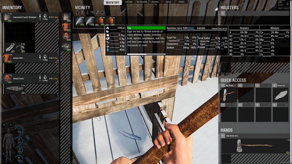 とりあえず最初はそのへんの石を調べて石ナイフを制作、続いて巨大石斧と手製バックパックの製作をしつつ、イモムシをムシャムシャと喰らいます。