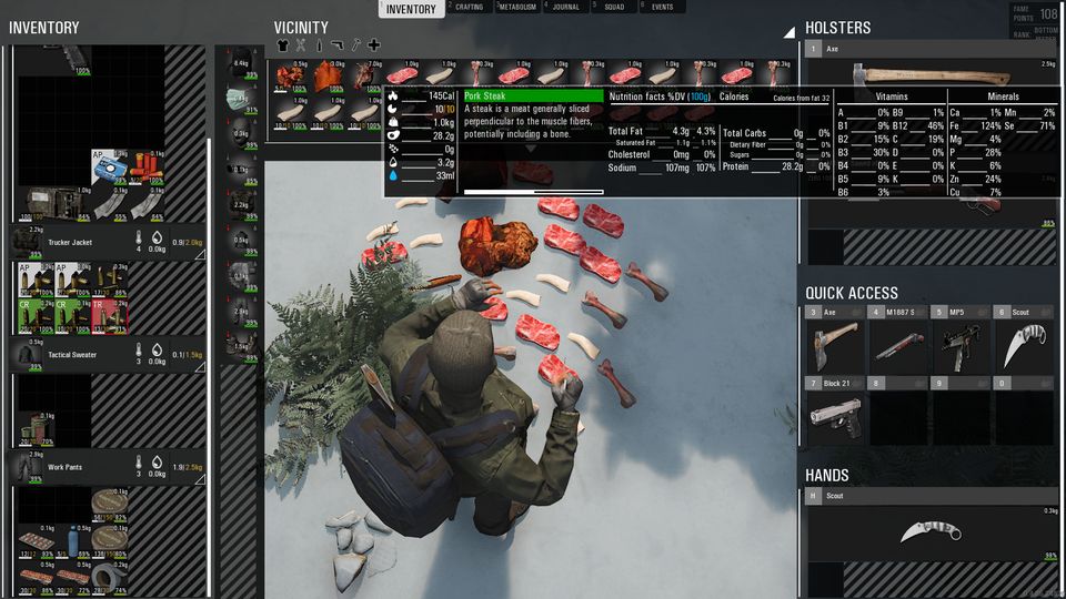他にもエアドロップ内にはチョコバーや牛肉缶、ラーメン缶、MRE、ビスケットなど豊富な食料品が揃っているが、これらはいずれも多量の脂質を含むカロリーダイナマイトな連中であるため、ダイエットにはまったく向かない。悲しいけど手をつけずに放置するほかない。