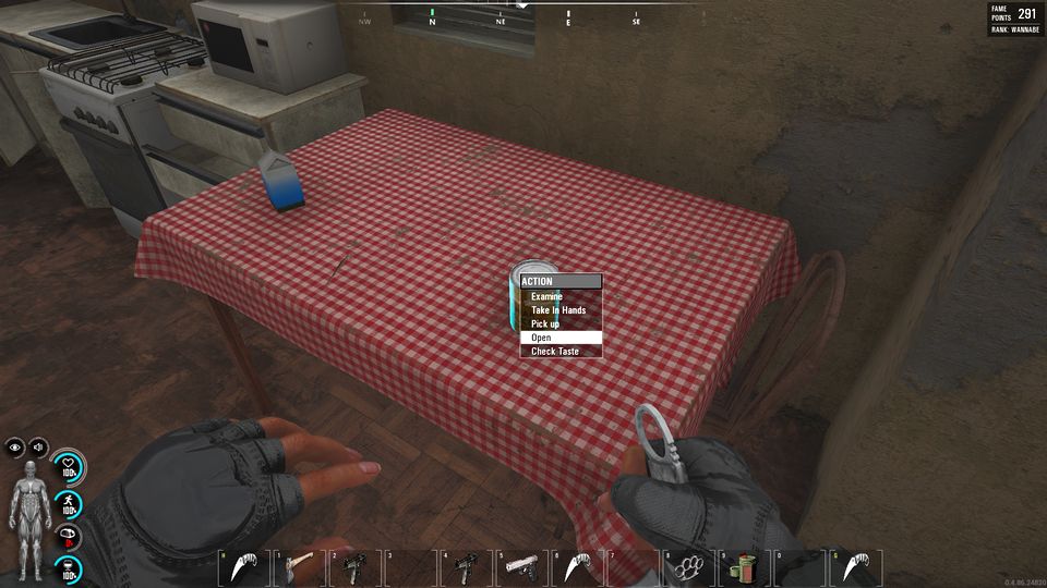 本作での缶詰の開封方法は少々独特だ。上の画面写真のようにマップ上に配置し、刃物(缶切りでなくてもよい。ナイフでOK)を装備した状態でアクセス、「Open」を選択する。