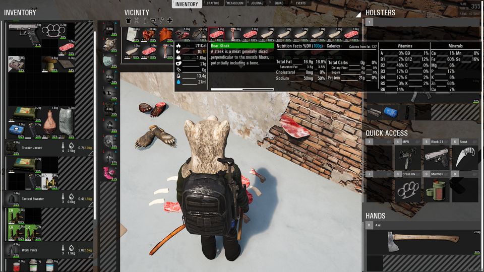 さて、肝心のクマ肉であるが…うん、脂肪が多過ぎる。とてもじゃないが食えたもんじゃない。無益な殺生をしてしまった…いや、正当防衛ではあるんだが。クマの脂は軟膏に使えるという話を聞いたことがある(あとめっちゃ熊の臭いがするので、他の動物が寄りつかなくなるらしい…)が、本作でそうした要素を取り上げることはないであろう。たとえばDay R Survivalでは脂肪からロウソクを作るなど、クラフト用素材としてけっこう重宝したものだが…